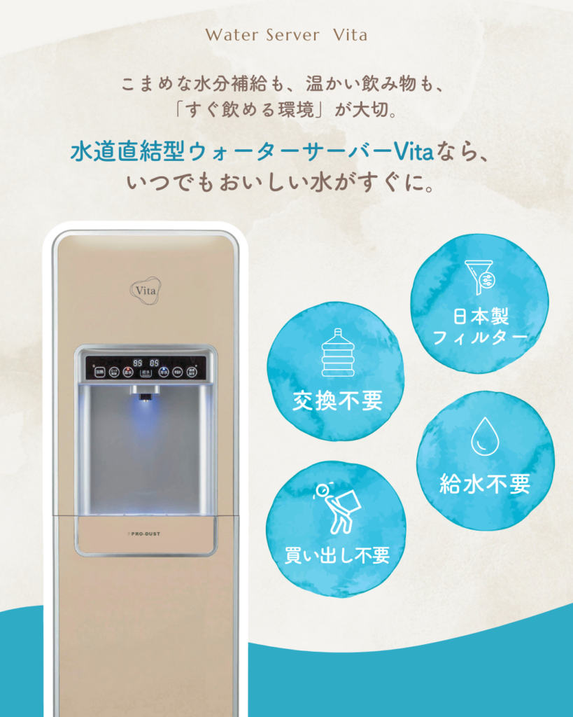 水道直結のウォーターサーバーVitaなら冷水も温水もすぐ使えて、